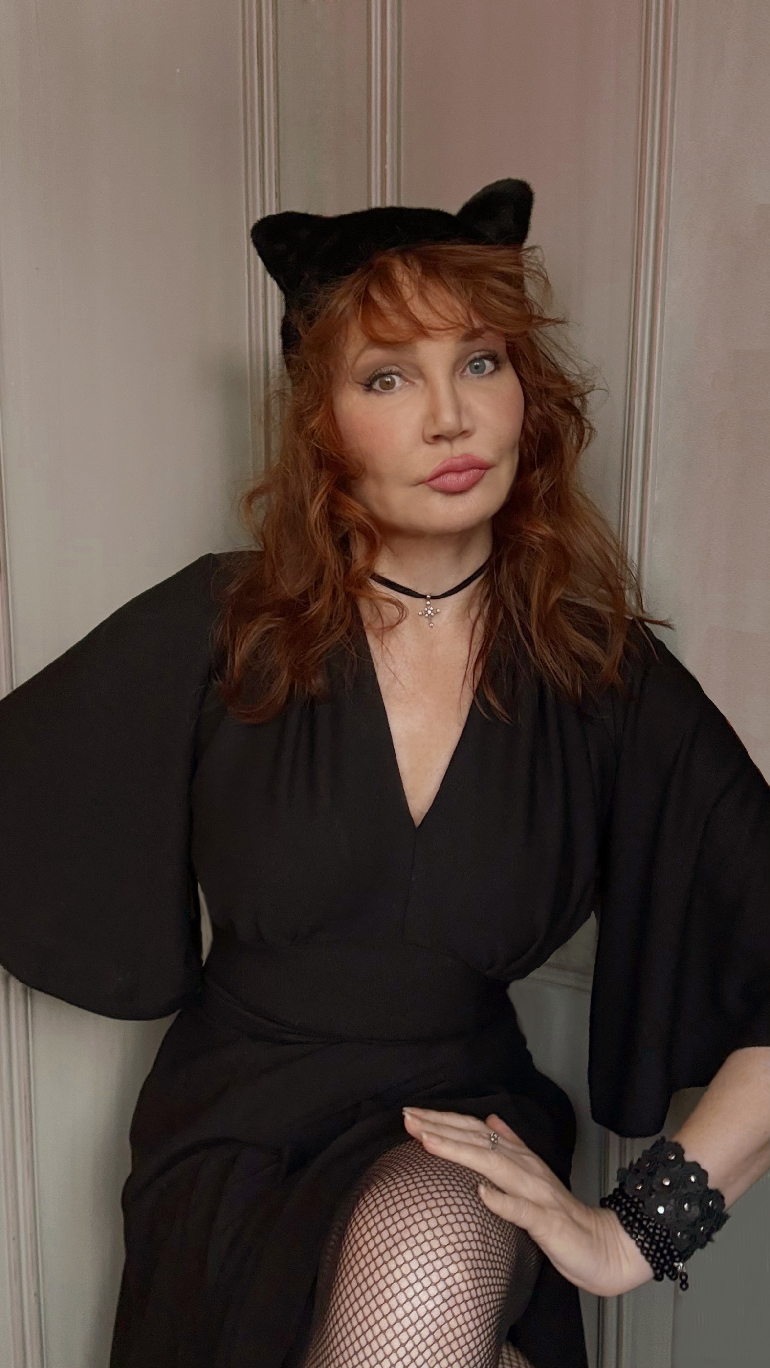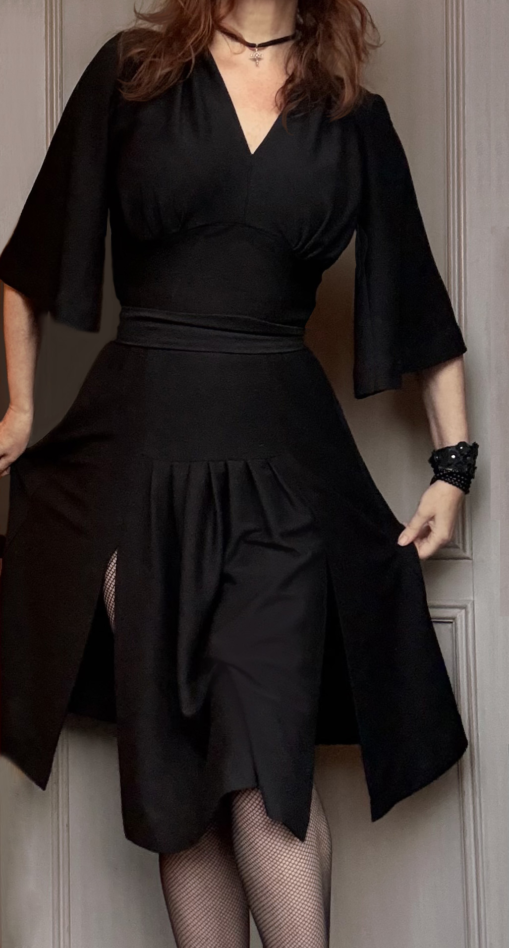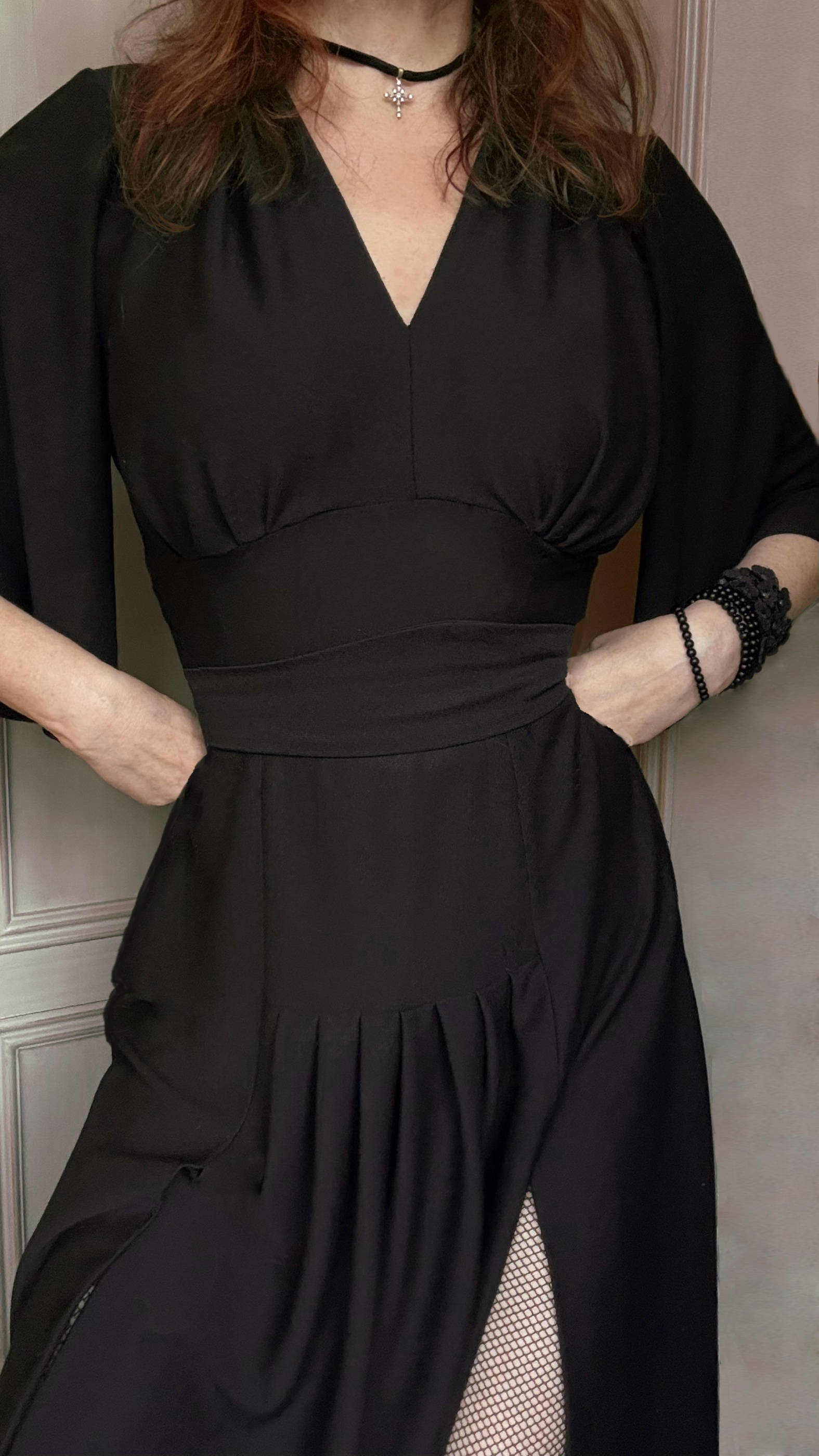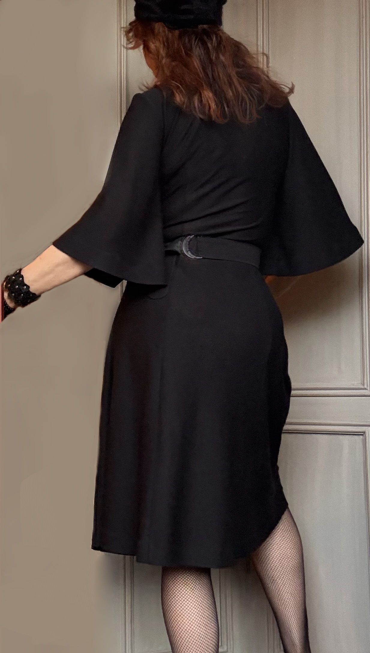 Gorgeous crepe jersey dress with flow and a flattering drape. The dress is very stretchy and has a removable belt and zipper in side. The sleeves is long enough to pull the coat over.