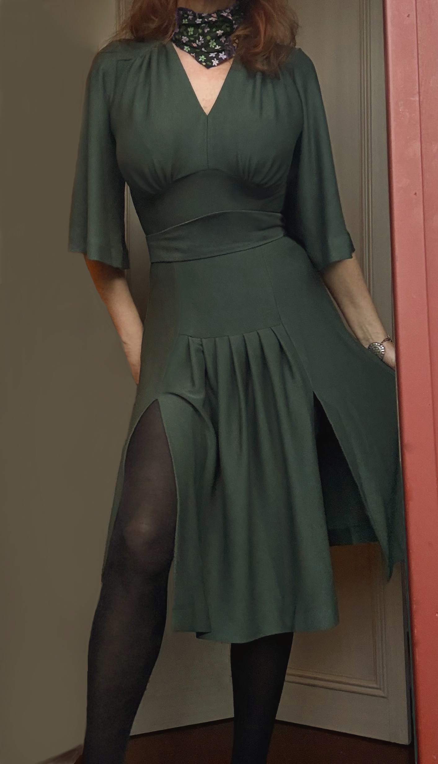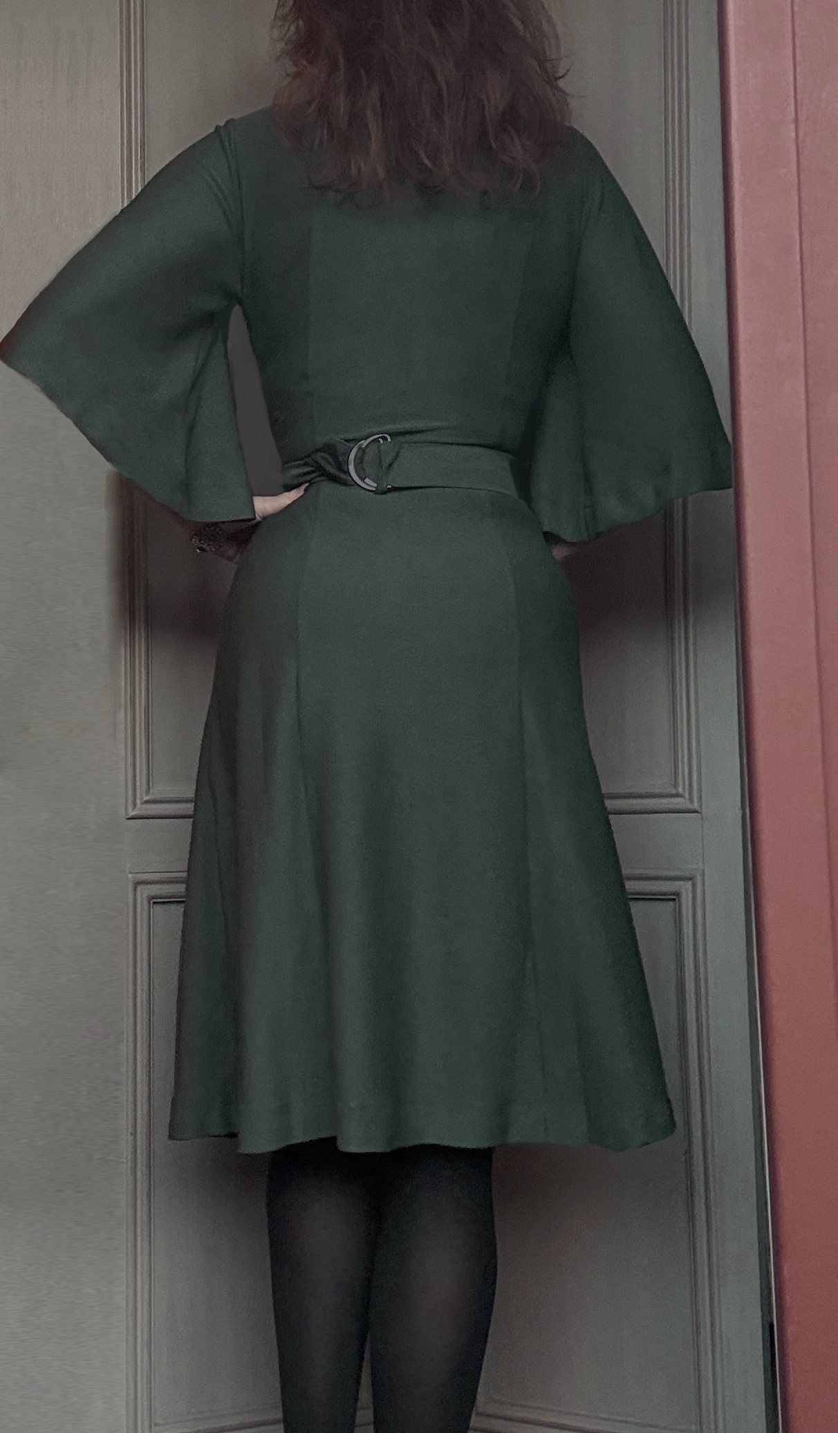 Gorgeous crepe jersey dress with flow and a flattering drape. The dress is very stretchy and has a removable belt and zipper in side. The sleeves is long enough to pull the coat over.