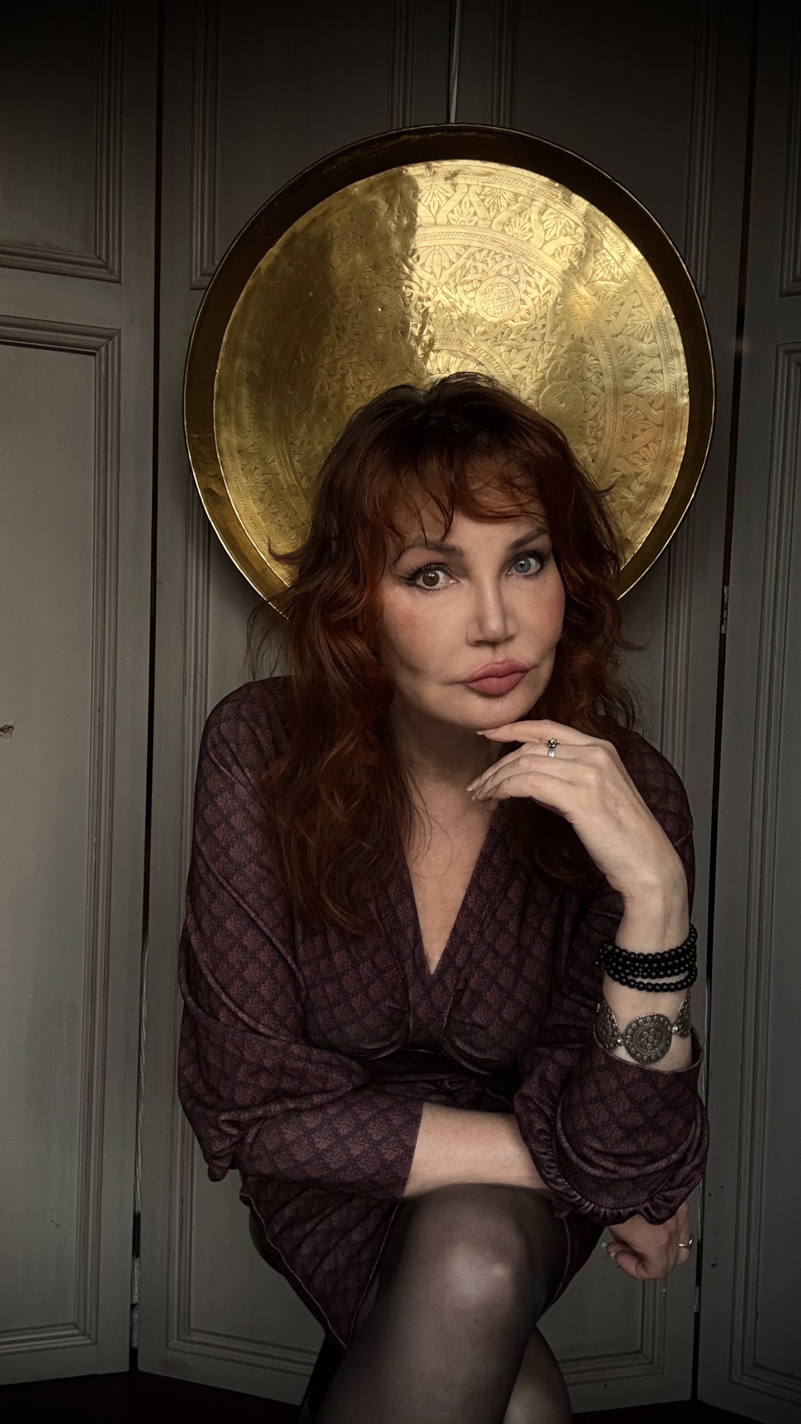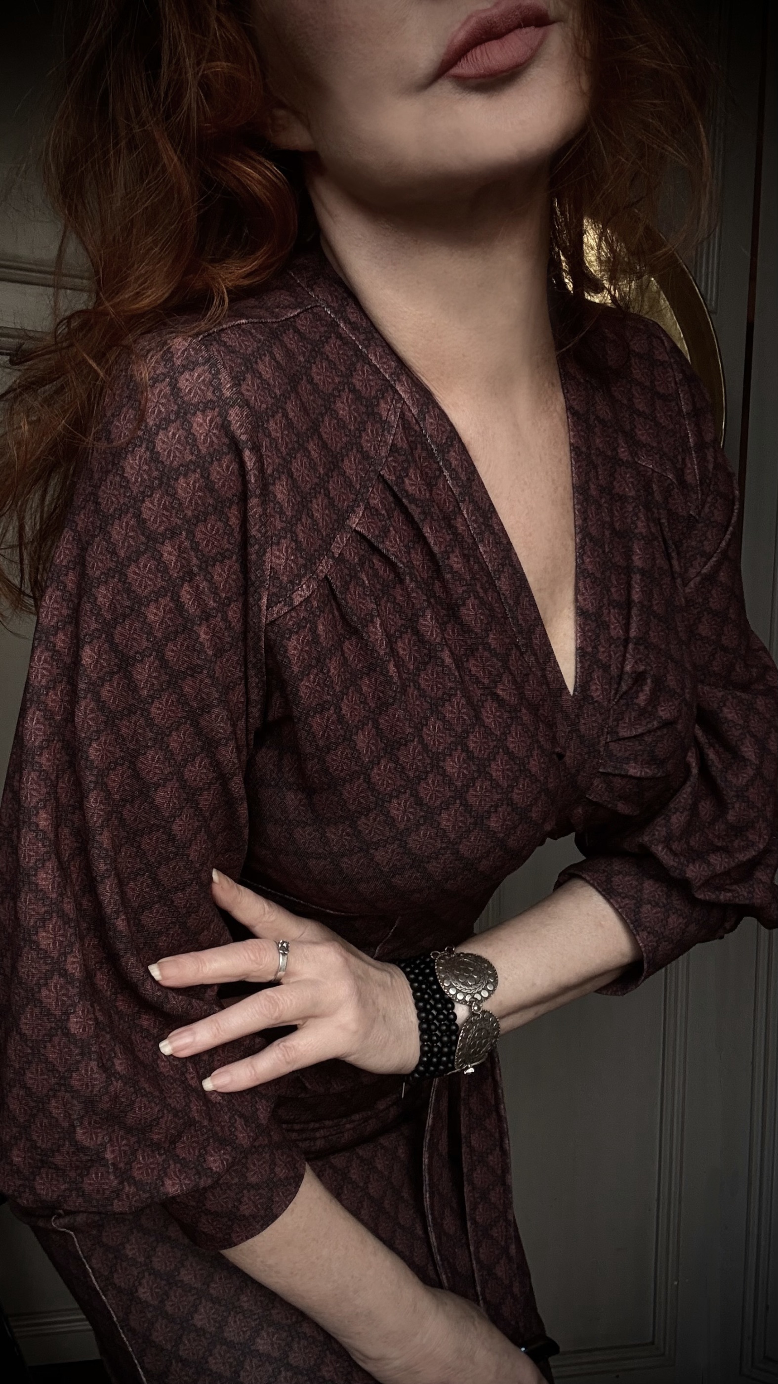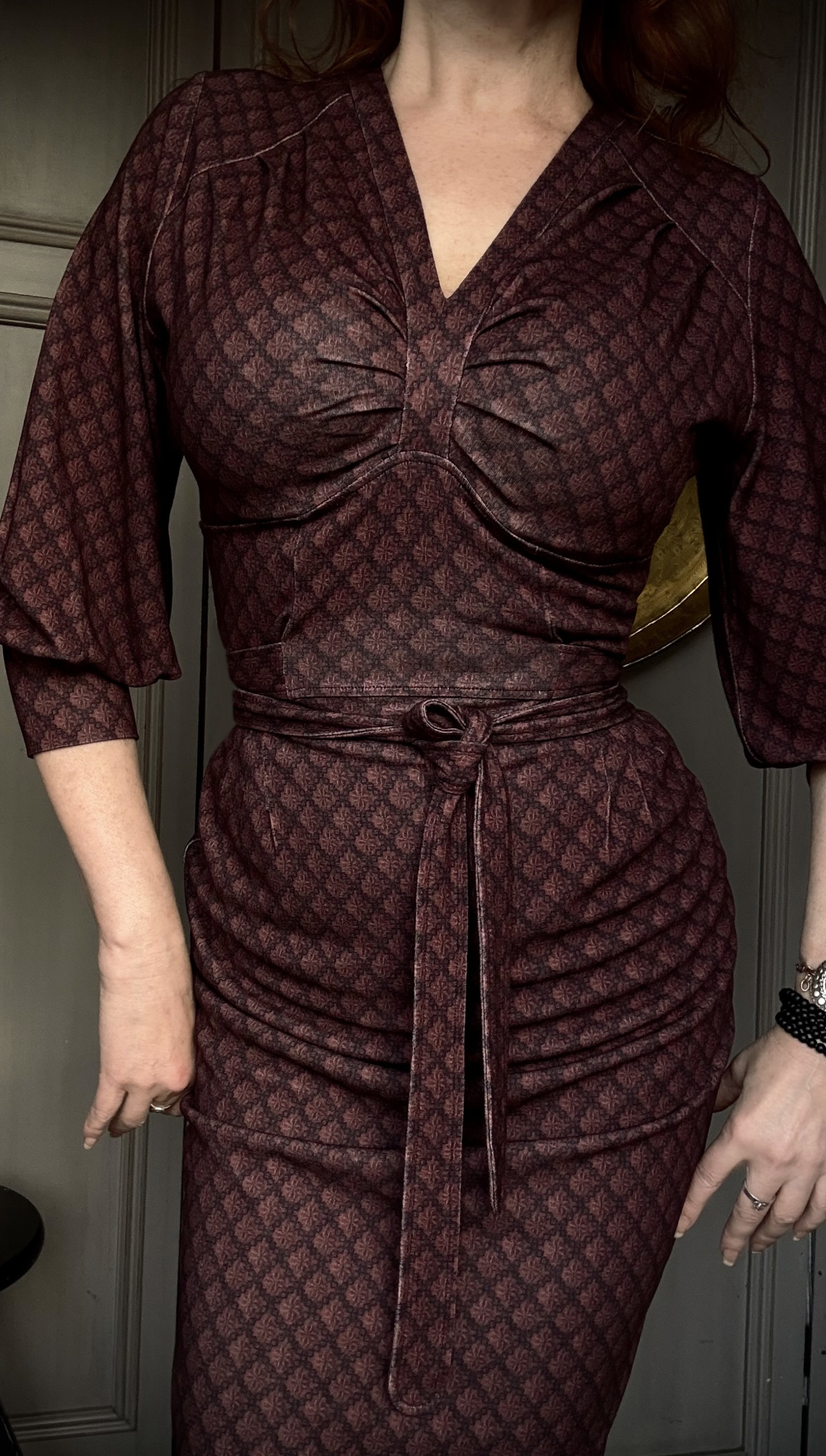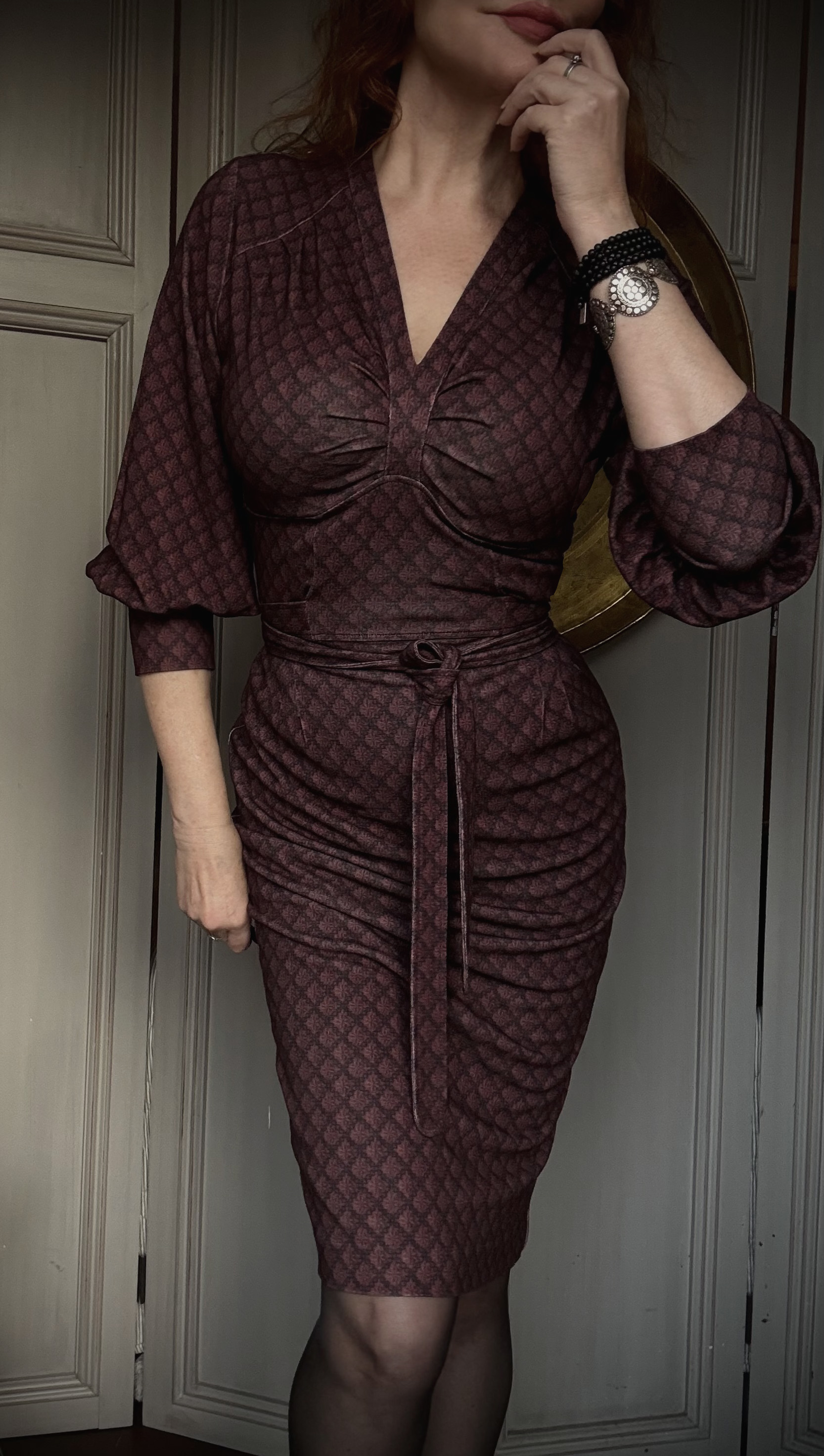Dress Fanny with an air of the magical 40s. Sewn in th softest viscose jersey, printed with my star pattern. The skirt part is lined with silky jersey.  Zipper and a neck button at the back.